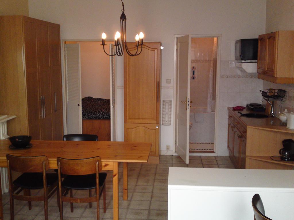 De zeer ruime studio met authentiek ornamenten plafond, heeft een verhoogd zitgedeelte met openslaande deuren naar de binnenplaats, zwart leren 2p slaapbank en relaxstoel, een tv, een eethoek, een sierschouw en een 2p bedstee met ruime berging en grote kleerkast. De licht eiken inbouw keuken is vv een groot model koelkast met vriesvak, een 2pits inductie kookplaat en een combitron. De badkamer heeft een bad met doucheplaats, een wastafel en hangend toilet. Verder is de studio goed geisoleerd, cv verwarmd, is er draadloos internet, een centrale waskamer en kan men gebruik maken van de besloten binnenplaats/tuin met tuinmeubilair en fietsenrekken.